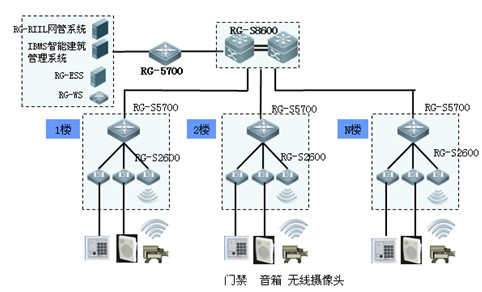 辦公大樓智能建筑網(wǎng)絡(luò)包含業(yè)務(wù)辦公網(wǎng)和智能化設(shè)備網(wǎng)。由于部分業(yè)務(wù)具有一定的機密性,因此需要考慮安全隔離與訪問控制,建議采用銳捷網(wǎng)絡(luò)應(yīng)用安全域解決方案。