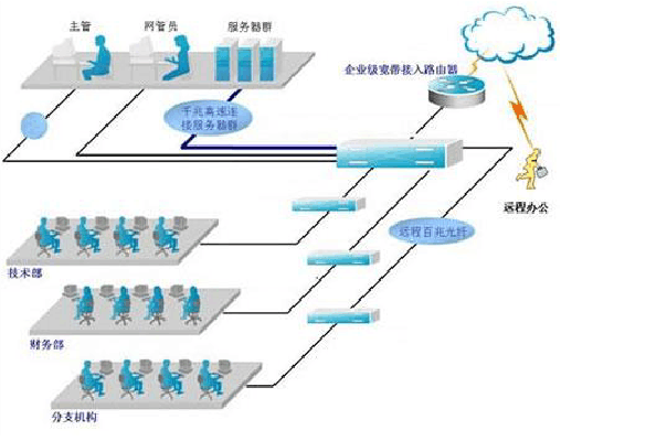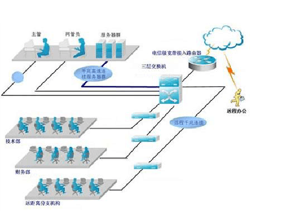 方案特點: ● 豐富的企業(yè)級網(wǎng)絡訪問 電信級寬帶接入路由器可保證企業(yè)內最大1000臺左右計算機公用一條寬帶線路上網(wǎng),可針對辦公網(wǎng)內不同用戶設定訪問不同的網(wǎng)絡資源;獨有的硬件防火墻功能,具有防止非法網(wǎng)絡攻擊和沖擊波等網(wǎng)絡病毒的攻擊的功能。 ● VPN保證遠程信息共享 VPN功能使得外地員工可通過互聯(lián)網(wǎng)與辦公室敏感數(shù)據(jù)實現(xiàn)保密的信息快速共享。 ● 高速帶寬設計保障大流量數(shù)據(jù)交換 千兆全線速三層交換機具有超大背板帶寬,可滿足企業(yè)網(wǎng)絡大流量數(shù)據(jù)交換,并可以千兆高速連接服務器,解決服務器訪問帶寬瓶頸問題; ● 三層交換配合VLAN分配保障企業(yè)網(wǎng)絡業(yè)務區(qū)分 全網(wǎng)支持VLAN劃分,可將不同業(yè)務部門分別劃分為不同的虛擬網(wǎng),并賦予不同的訪問權限,VLAN間可實現(xiàn)全線速三層交換,避免重要部門信息機密泄漏或病毒風暴泛濫導致網(wǎng)絡癱瘓。 ● 圖形化網(wǎng)絡配置實現(xiàn)一站式管理 遠程網(wǎng)管軟件可協(xié)助網(wǎng)管員不需要專業(yè)知識即可通過圖形化配置實現(xiàn)一鍵式網(wǎng)絡管理,輕松實現(xiàn)全網(wǎng)掌控。 ● 安全策略保證企業(yè)數(shù)據(jù)安全 通過端口鏡像、端口綁定、廣播風暴抑制等一系列豐富安全策略,協(xié)助成長型企業(yè)快速實現(xiàn)網(wǎng)絡信息共享,同時不會因此而導致內外部網(wǎng)絡攻擊或病毒攻擊造成重要數(shù)據(jù)泄密或網(wǎng)絡癱瘓。